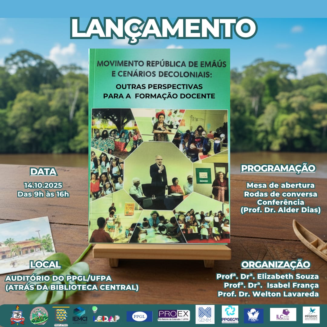 No dia 14 de outubro ocorrerá o lançamento do 2° livro do Movimento República de Emaús, intitulado "Movimento República de Emaús e Cenários Decoloniais: Outras perspectivas para a formação docente". A programação será de 09h às 16h da tarde no auditório do PPGL, no setor básico da Universidade Federal do Pará, atrás da Biblioteca Central.